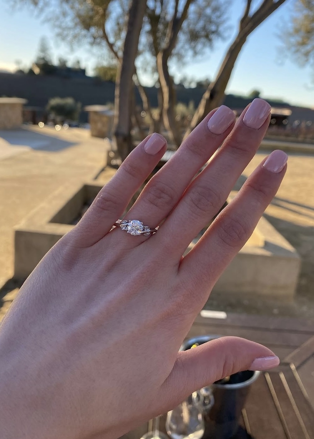 Crafted in luminous 14k white gold, the design features delicate vine-like details that wrap gracefully around the band. Inspired by nature’s effortless beauty, the setting mirrors the vineyard surroundings where the proposal took place—symbolizing growth, connection, and a love that continues to flourish over time.
