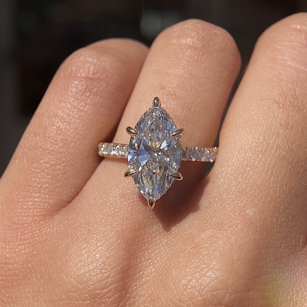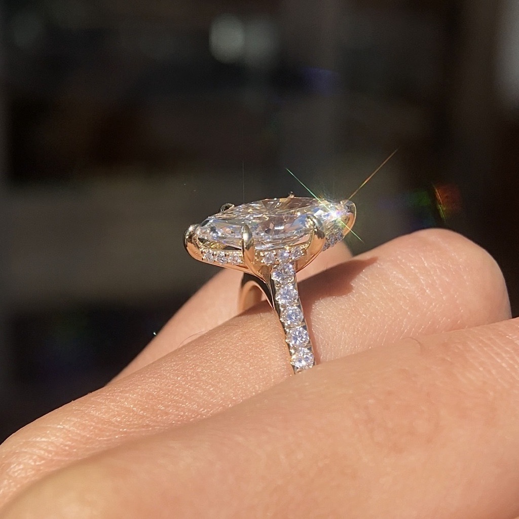 Our client worked closely with Ashton, who took the time to understand every detail of what they imagined. From the start, Ashton focused on translating their ideas into something tangible, offering thoughtful guidance and expert insight along the way. Together, they designed a ring that was both striking and deeply personal: a six-prong 3.5-carat marquise diamond, paired with a diamond-accented band and a hidden halo.